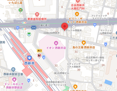 改札を出て右方向東口へ進み、イオン西新井店裏側左手にございます。